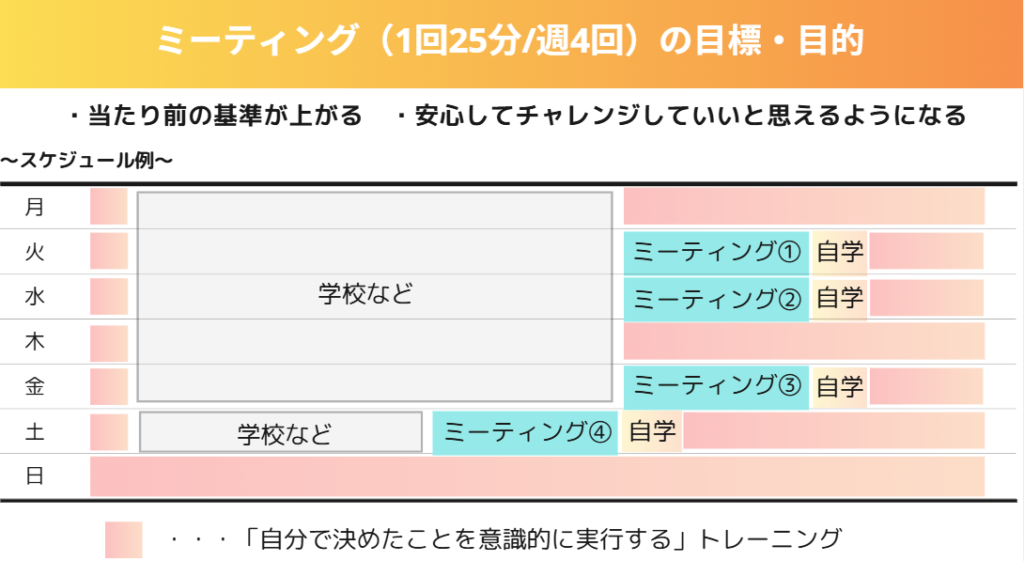 1回25分週4回の高頻度のミーティングにて、習慣力と独学力を磨き、「自走できる力」を養っていきます。